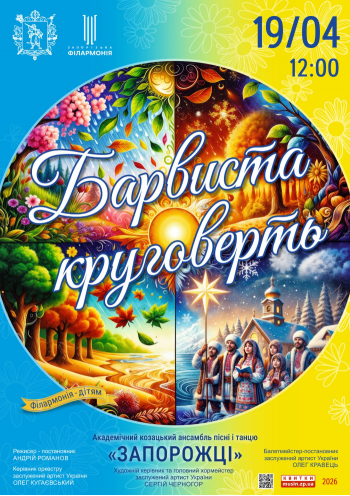 Завітайте всією родиною до Філармонії на концертну програму «Барвиста круговерть» 19 квітня о 12:00! Відчуйте чарівність народної музики, доторкніться до традицій і разом із ансамблем «Запорожці» вирушайте у подорож крізь час і пори року.
