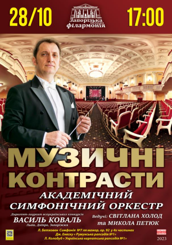 28 жовтня у Запорізькій обласній філармонії прем'єра концертної програми «Музичні контрасти» академічного симфонічного оркестру під керуванням лауреата всеукраїнських конкурсів, диригента Василя Коваля.